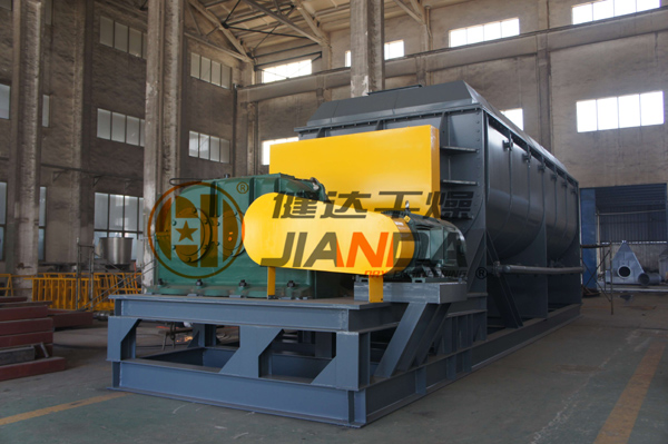 此設(shè)備單臺外形長寬高分別為14.2m,3.7m,3.6m。3臺設(shè)備每天共可烘干成品800t。在材質(zhì)上,設(shè)備上箱體,下箱體,端蓋板都使用了碳鋼制作,其中,由于槳葉結(jié)構(gòu)特殊,采用了特殊鋼制作,并做酸化處理。