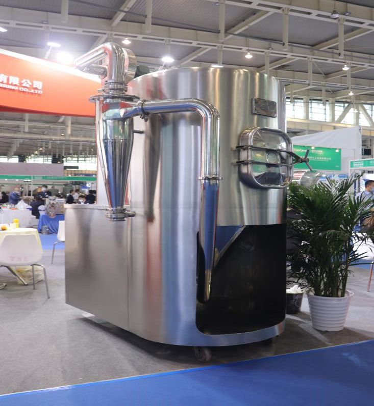 LPG系列高速離心噴霧干燥機也是健達干燥在本次展會上備受矚目的一款產品,其工作原理是空氣經過濾和加熱,進入干燥器頂部的空氣分配器,熱空氣呈螺旋狀均勻地進入干燥室。料液經塔體頂部的高速離心霧化器,(旋轉)噴霧成極細微的霧狀液珠,與熱空氣并流接觸在極短的時間內可干燥為成品。