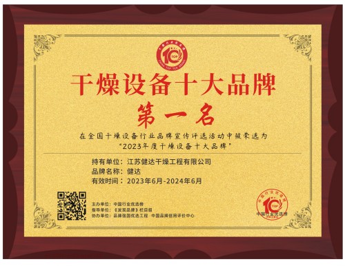 2023年6月7日,中國行業優選榜聯合《發現品牌》欄目組、品牌強國優選工程等權威組織共同發起的2023年度“干燥設備十大品牌”評選活動圓滿落幕。健達干燥通過不斷創新研發,打造工匠產品,提高項目申報通過率,在“中國干燥設備行業十大品牌”評選中獲得中國十大干燥品牌第一。
