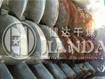 空心軸上密集排列著楔型中空漿葉,熱介質經空心軸流經漿葉。單位有效容積內傳熱面積很大,熱介質溫度從-40℃到320℃,可以是水蒸汽,也可以是液體型:如熱水、導熱油等。間接傳導加熱,沒有攜帶空氣帶走熱量,熱量均用來加熱物料。熱量損失僅為通過器體保溫層向環境的散熱。楔型漿葉傳熱面具有自清潔功能。物料顆粒與楔型面的相對運動產生洗刷作用,能夠洗刷掉楔型面上附著物料,使運轉中一直保持著清潔的傳熱面。漿葉干燥機的殼體為Ω型,殼體內一般安排二到四根空心攪拌軸。殼體有密封端蓋與上蓋,防止物料粉塵外泄而充分發揮作用。傳熱介質通過旋轉接頭,流經殼體夾套及空心攪拌軸,空心攪拌軸依據熱介質的類型而具有不同的內部結構,以保證佳的傳熱效果。